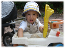 Als nächstes heisst es - alle Kinder anziehen. Wir gehen raus. Je nach Wetterbedingungen und je nachdem wie viele Kinder da sind, machen wir einen Spaziergang, spielen im Garten oder gehen auf den Spielplatz. Ich habe einen Zwillingswagen, der für die ganz Kleinen zum Einsatz kommt. Im Garten parken diverse kleine Fahrzeuge, wie z.B. ein Lauflernwagen, eine Kinderschubkarre, ein Puppenbuggy oder ein Bobbycar. Die "Großen" schnappen sich also gerne ein Fahrzeug und dann geht es raus zum Hinterausgang des Gartens in den kleinen Park zwischen den Häusern...